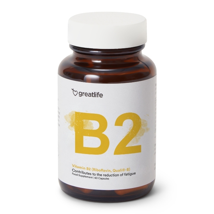 Vitamin B2 (Riboflavin, Quali®-B) fra Greatlife er et rent og godt dokumentert vitamin av farmasøytisk kvalitet. Riboflavin spiller en sentral rolle i kroppens energiomsetning og er avgjørende for at cellene skal kunne omdanne næring til brukbar energi. Det bidrar til å redusere tretthet og utmattelse, samt til nervesystemets normale funksjon og normal psykologisk funksjon. Vitamin B2 bidrar også til å opprettholde normal hud og normale slimhinner, samt til immunsystemets normale funksjon og normal omsetning av jern. Vitamin B2 fra Greatlife er et høykvalitets kosttilskudd med nøye kontrollert råvare, fritt for tilsetningsstoffer, forurensninger og kunstige stoffer.