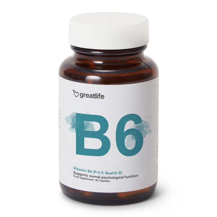 Vitamin B6 (P-5-P, Quali®-B) fra Greatlife er et rent og godt dokumentert vitamin av farmasøytisk kvalitet i sin aktive form, Pyridoxal-5′-phosphate. Vitamin B6 spiller en sentral rolle i kroppens energiomsetning og er avgjørende for omsetningen av aminosyrer og nevrotransmittere. Det bidrar til å redusere tretthet og utmattelse samt til nervesystemets normale funksjon og normal psykologisk funksjon. Vitamin B6 bidrar også til å regulere hormonell aktivitet og til normal dannelse av røde blodceller. Vitamin B6 fra Greatlife er et høykvalitetstilskudd med nøye kontrollert råvare, fritt for tilsetningsstoffer, forurensninger og kunstige stoffer.